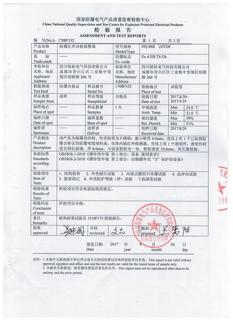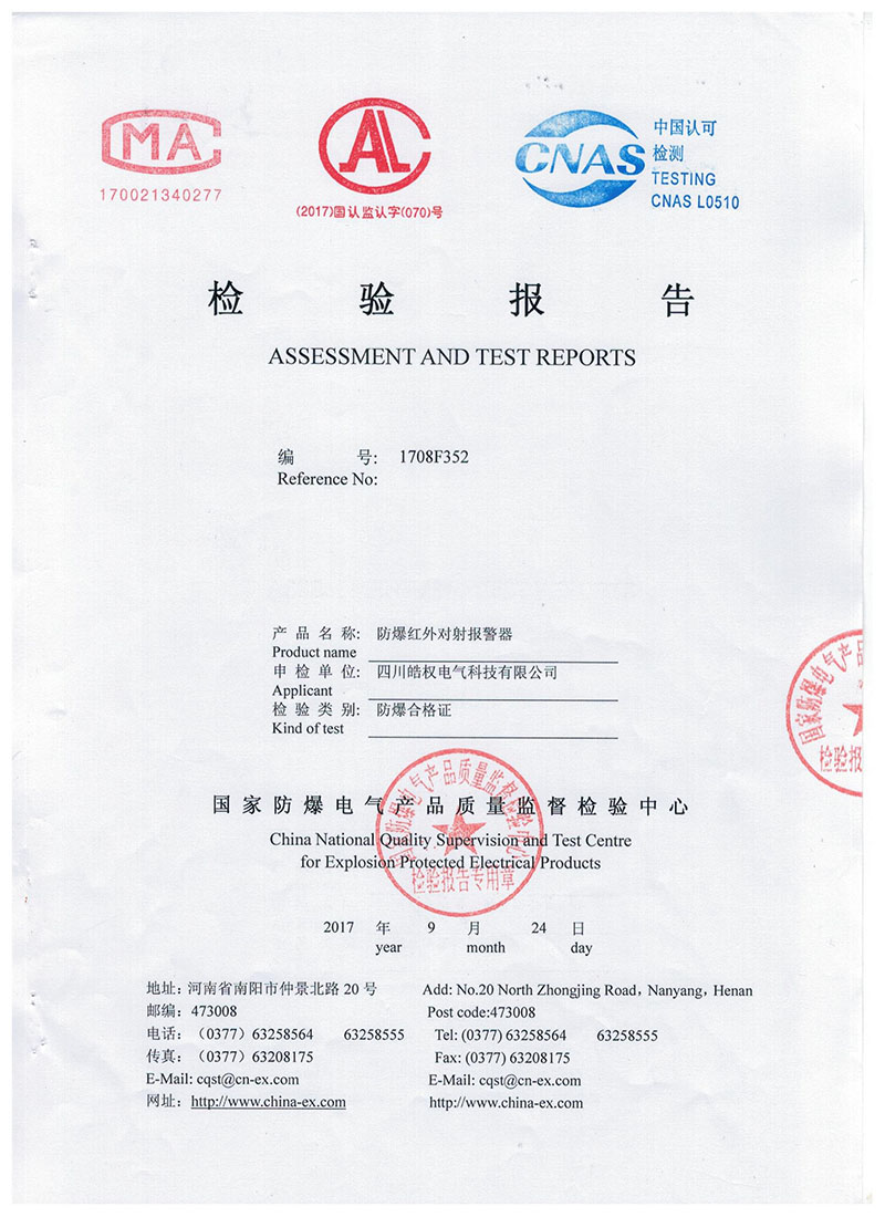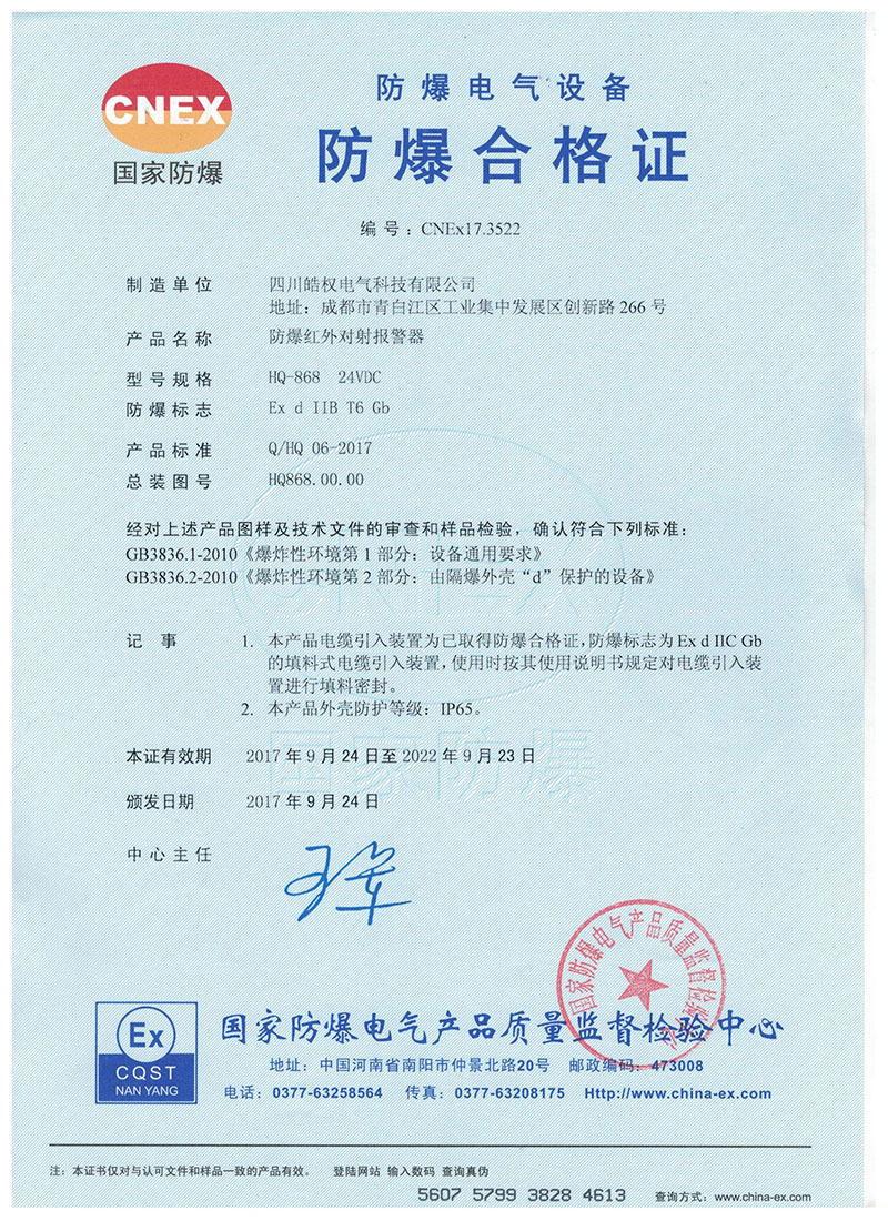 四川皓權電氣科技有限公司的防爆紅外對射報警器榮獲 "國家防爆產品合格證"產品