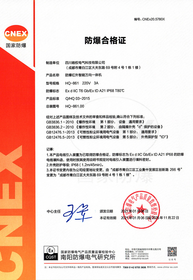 四川皓權電氣科技有限公司的防爆紅外智能萬向一體機榮獲"國家防爆合格證"產品,詳情請查看具體內容!