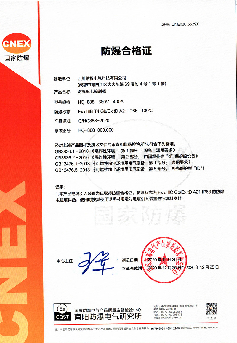 四川皓權電氣科技有限公司的防爆控制柜榮獲 "國家防爆合格證"產品,詳情請查看具體內容!