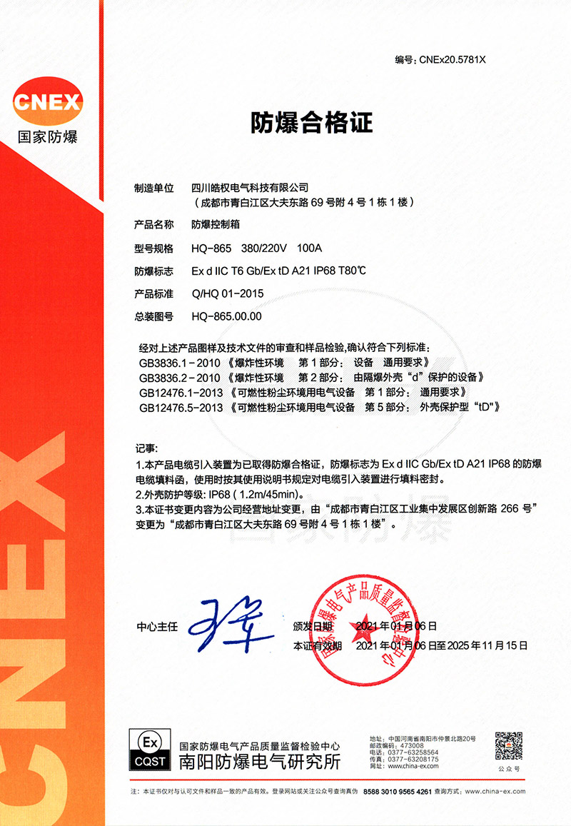 四川皓權電氣科技有限公司的防爆控制箱榮獲"國家防爆合格證"產品,詳情請查看具體內容!